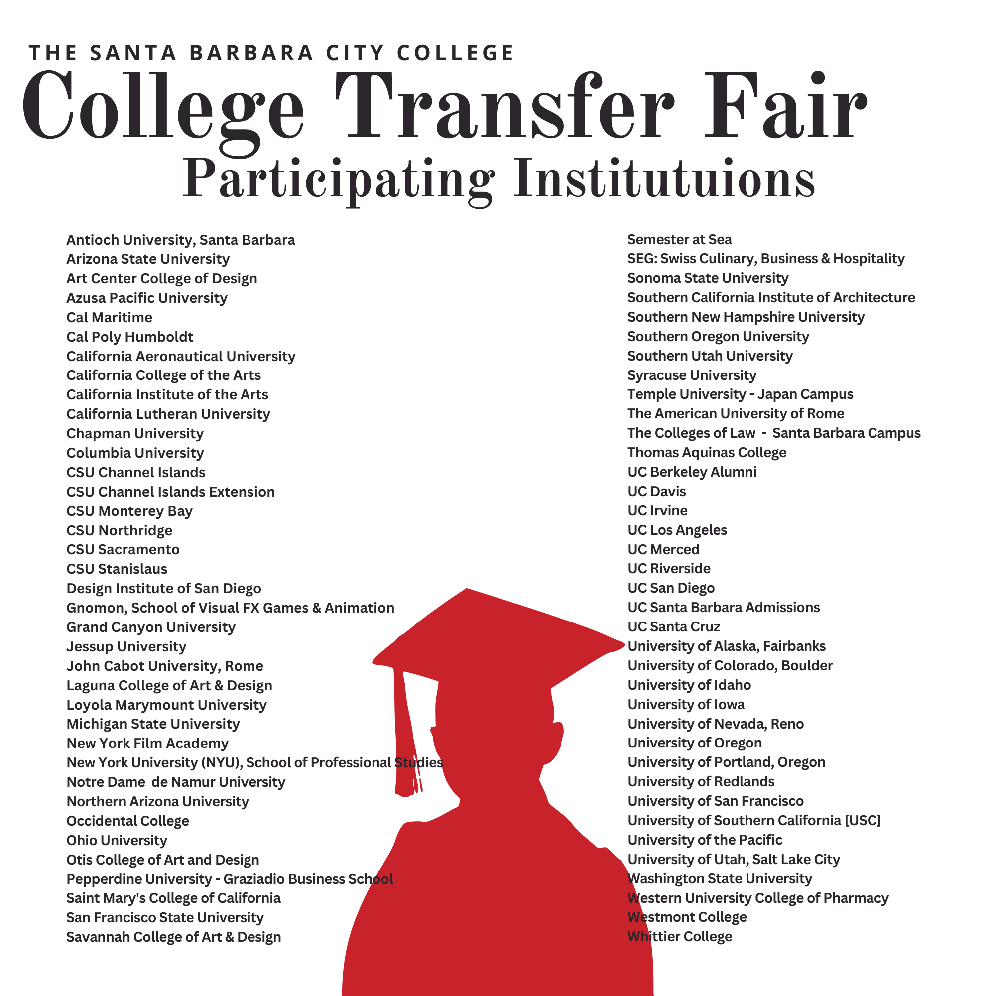 Please join us on Wednesday, October 29, at the West Campus Great Meadow Lawn from 11:00 a.m. to 2:00 p.m. Meet with more than 70 college admission representatives, connect with SBCC departmental representatives, and engage with your fellow transfer peers.